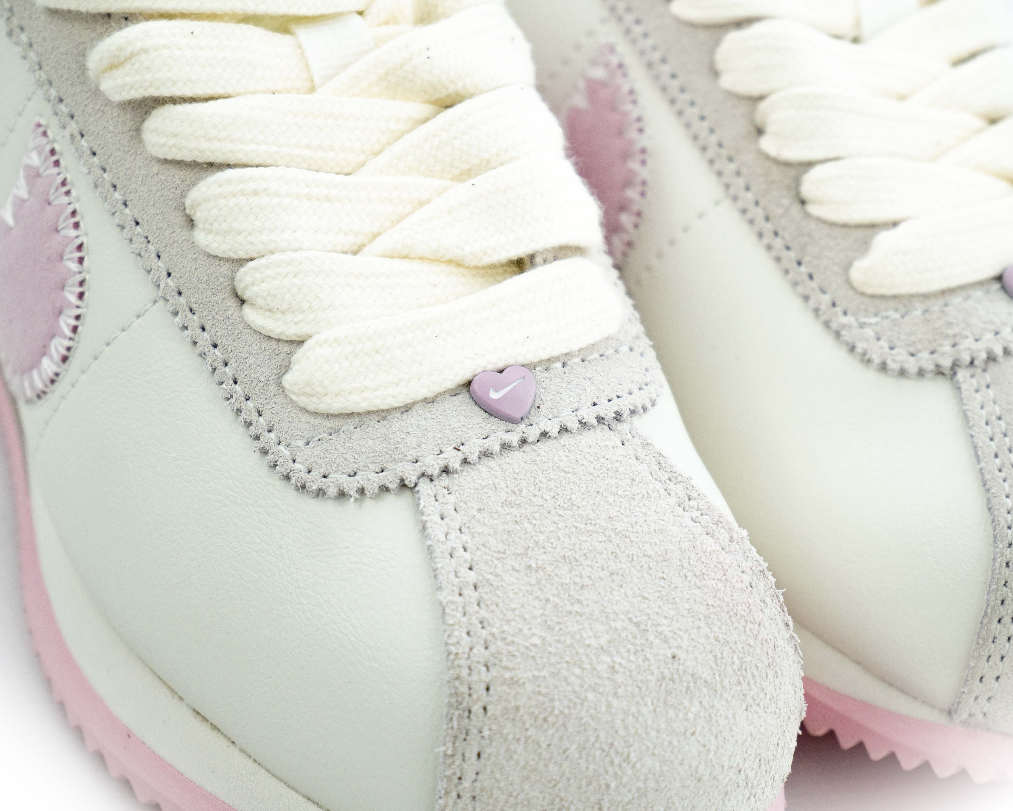 Новинка сезона 2025 года – лимитированная коллекция кроссовок Nike Cortez, посвященная Дню святого Валентина. Модель привлекает внимание элегантным сочетанием материалов: премиальная кожа оттенка “парус” дополнена вставками из замши в передней и задней части обуви. Декоративная прошивка изящно обрамляет фирменный логотип Swoosh, выполненный из нежно-розовой замши.